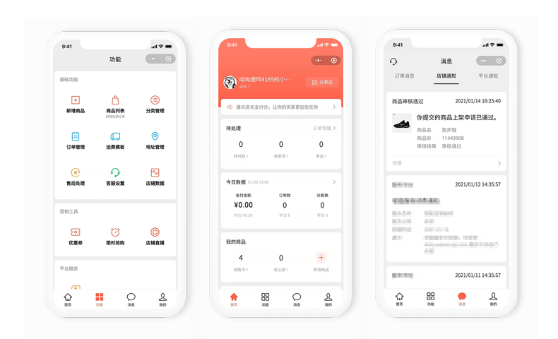商品管理、售后处理、店铺数据、订单管理